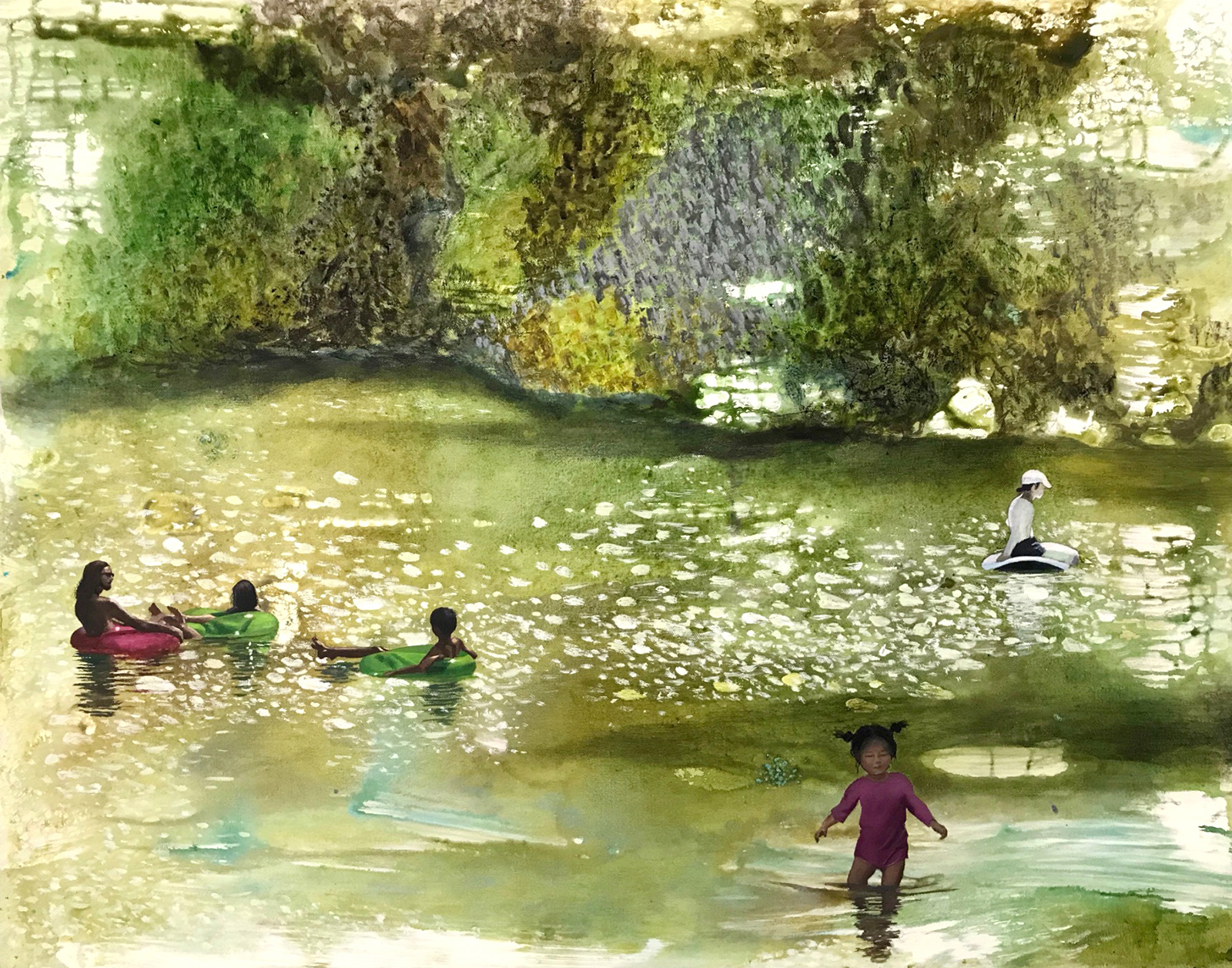 This is a painting of people floating on the south side of China Camp Village during a particularly hot day.