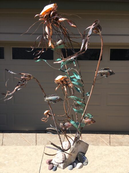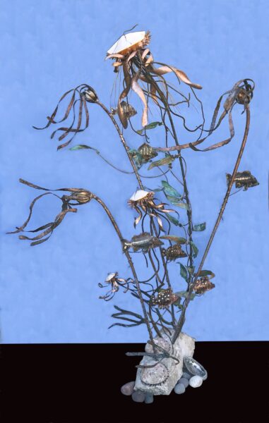 With an eye toward realism the sea life at differing depths Harkin brings the authenticity of the giant plant life with the ever changing vertebrates as well as crustacean monopods. Copper, glass and stone. 8’6”h x 36”d x 64”w.