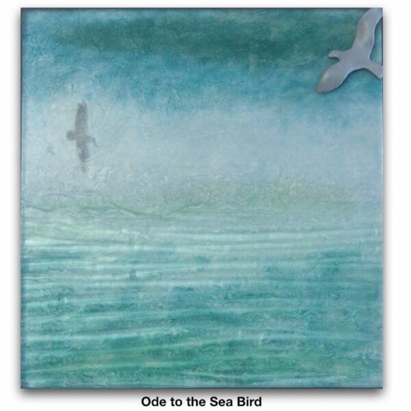 This 10 inch square waterscape in my Symphony series is created using old window glass – one of the least recycled materials. The pieces are enameled kiln cast and sand blasted. The etherial textural images are meant to focus on the wonder and beauty of our environment and our shared responsibility to care for it. The pieces in the series are surprisingly light weight and are designed to hang well alone or several together make a notable grouping.
