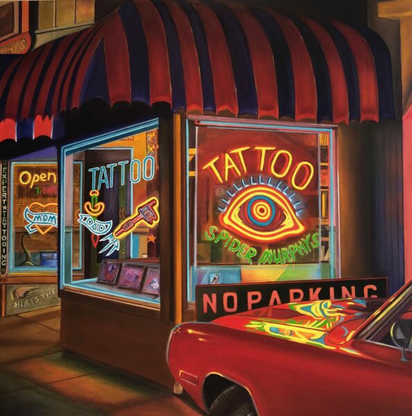 Based on Spider Murphy’s Tattoo parlor in downtown San Rafael CA. More than two dozen photos and numerous visits to the location day and night and in the rain were used as references to create this impression.