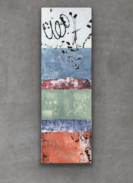 A 36″ x 12″ collaged panel made up of individual collages created using acrylic paint and inks. Sides painted black.