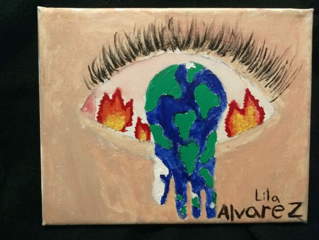 “I just thought what the end of the world would look like from someone’s eye. And I thought they would be crying so I used the earth.”-The 3rd grade artist Lila said about her painting and then wrote a poem called Black Thoughts: