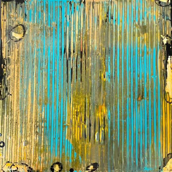 Subtle metallic silver and metallic ground with vibrant yellow and teal.