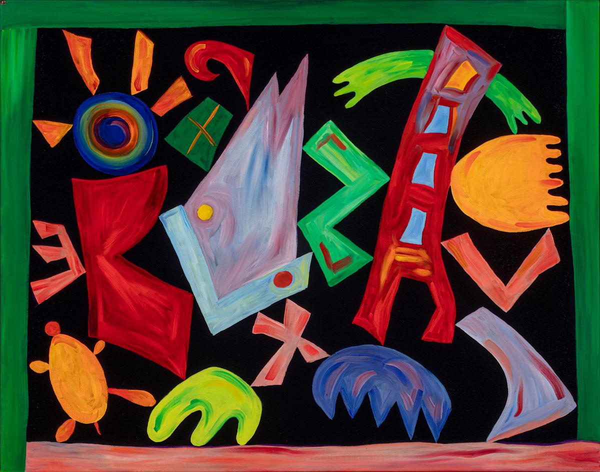 ‘This That and the Other’ is a 22″x28″ oil painting on canvas. Whimsical is a more apt descriptor than abstract because there are objects that are not abstract. Notice that all the objects are touching, connected.