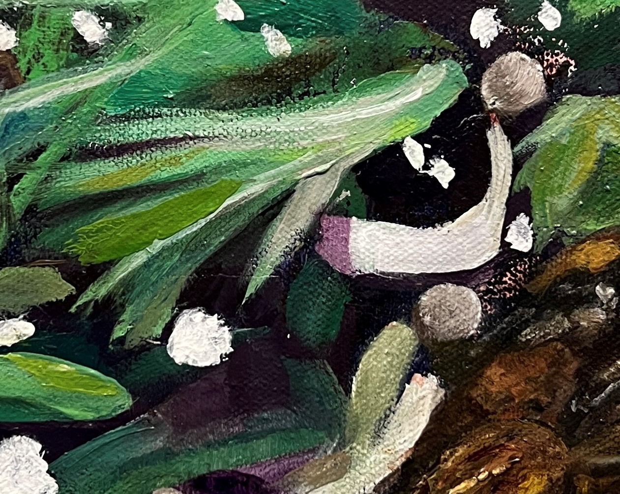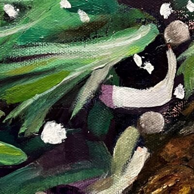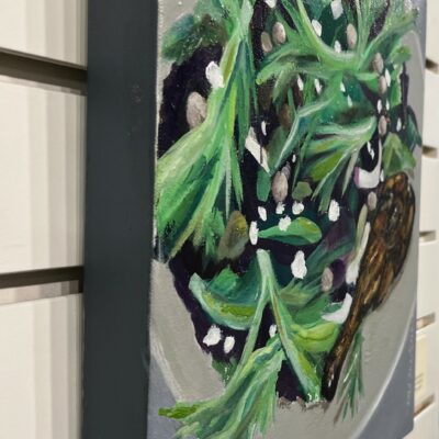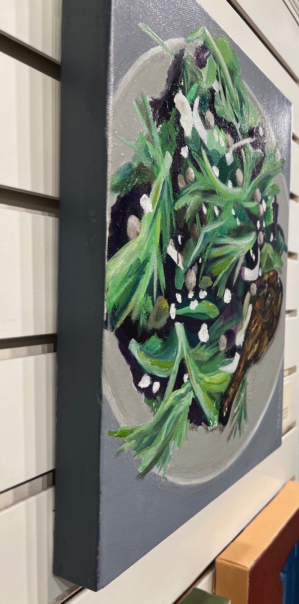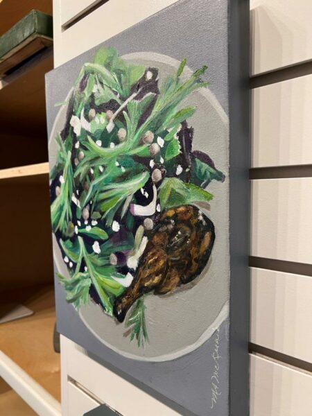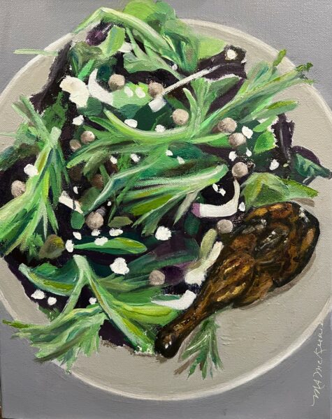 My husband’s delicious cooking prompted this painting of a salad of frisée, radicchio, sprouted mixed beans, goat cheese and roast duck.