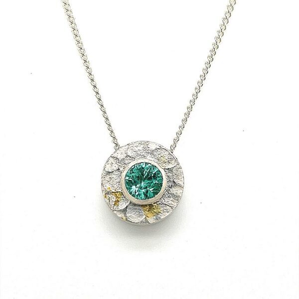 | Tourmaline Pendant with 22K gold highlights. Hollow-formed pendant with fine silver bezel and sterling silver textured components. 22K gold pressed highlights added. I cut this bright tourmaline crystal from Afghanistan at almost 1carat with my favorite faceting pattern called ‘Old Faithful’. ½ “ W with 18” silver chain included. |