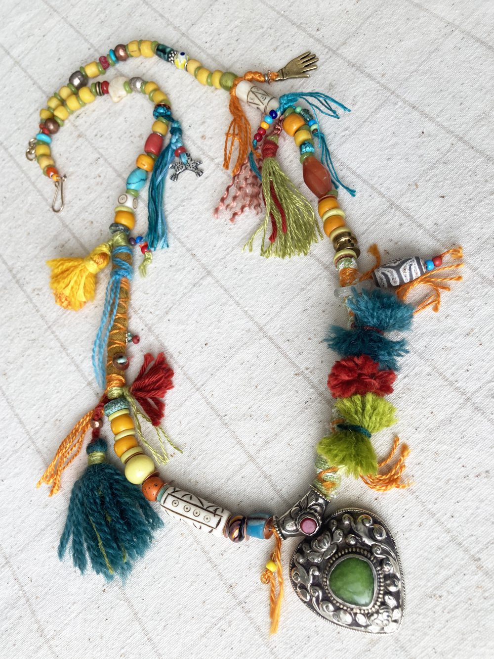 “Treasure Hunt Necklace” was created using decades-long collections of ethnic beads, yarns, fabrics and hoarded finds. I feel fortunate to have a unique collection of mediums from which to create my current work. Length: 30″