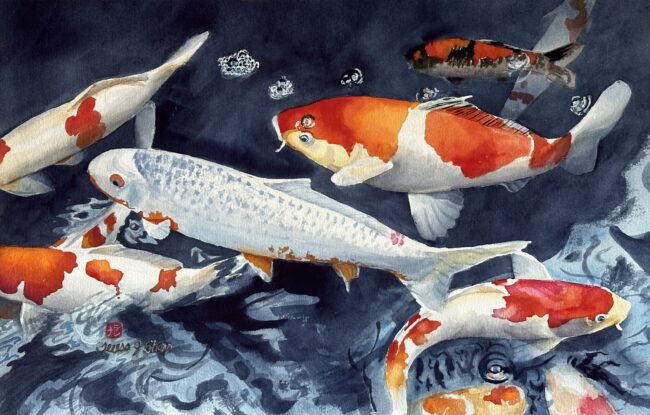 These colorful Koi always bring a smile to my face. This 11×17 inch watercolor is framed without a mat creating an interesting almost aquarium look. I used layers of transparent watercolor for vivid color and depth with touches of opaque white for the brightest highlights.