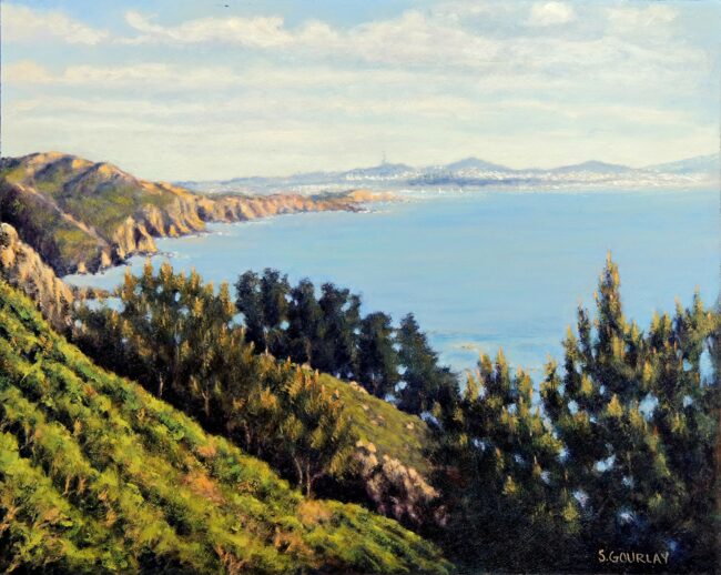 Oil on textured hardboard panel 16 by 20 inches. Just North of Muir Beach Highway 1 rises to the cliffs overlooking the Pacific Ocean. Stunning views of the Marin Headlands and San Francisco are seen after a short walk from the overlook parking lot.