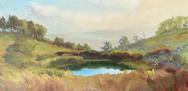 16″ x 8″ oil on canvas, plein air painting of a small spring-fed pond on the Inverness ridge above Limantour Beach and the esteros.