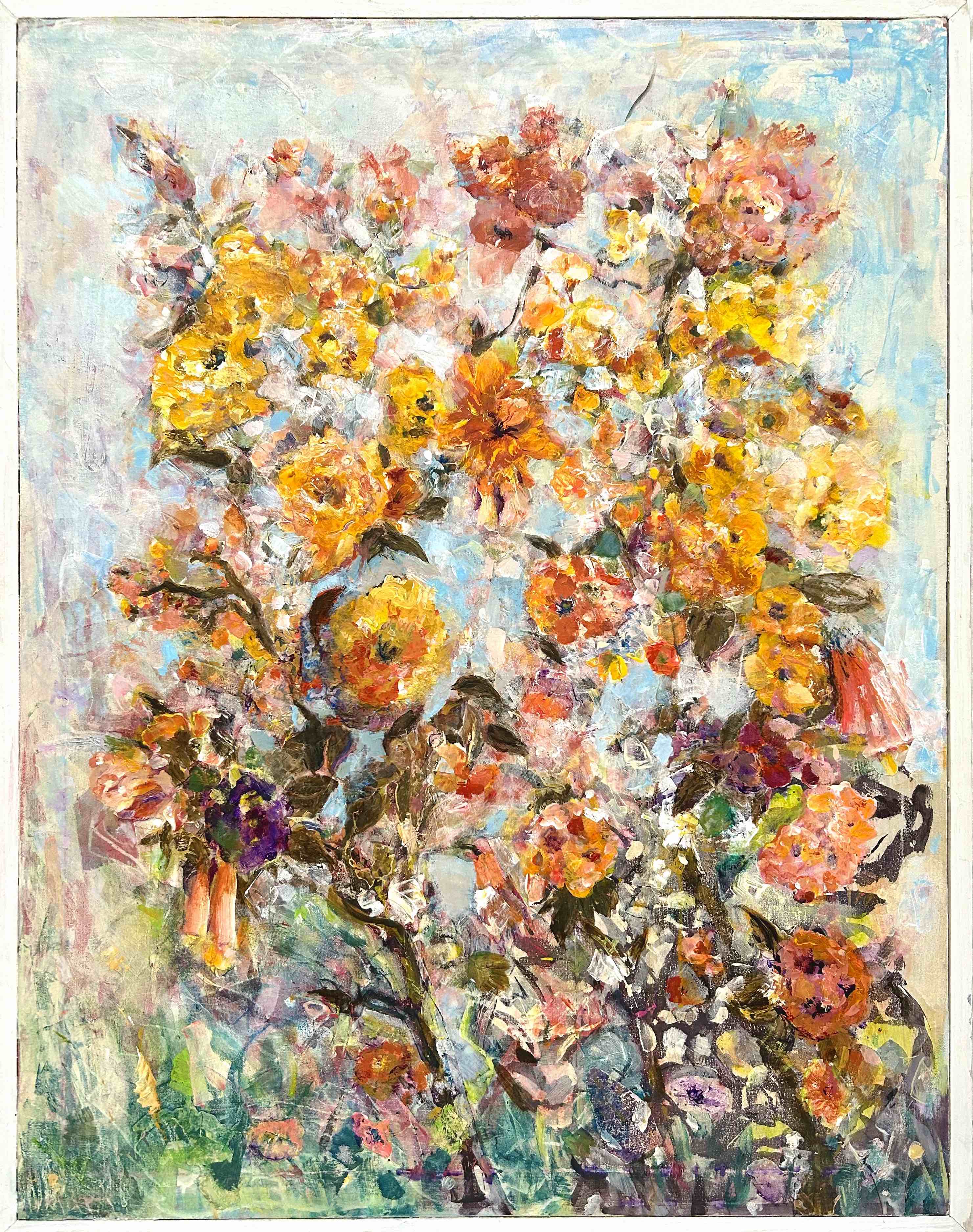 This painting is bursting with color and energy. It has elements of expressionism due to the somewhat abstracted forms and vibrant color palette. The paint is applied thickly, over collaged elements, adding a three-dimensional quality to the petals and leaves. The painting conveys a sense of joy, abundance, and vitality.