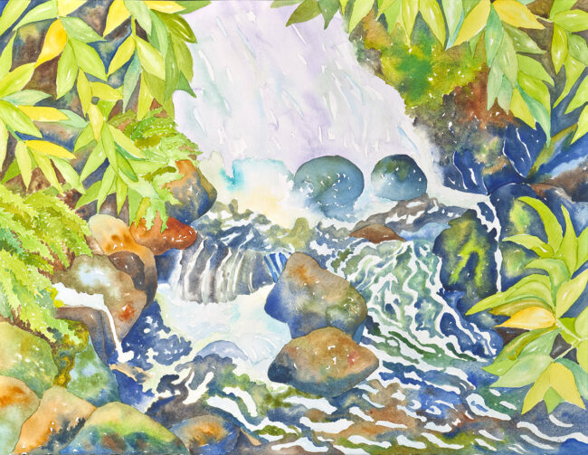 Original watercolor painted on Arches 140 lb. cold press paper of a waterfall at Lake Lagunitas in Marin County.