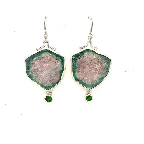 Watermelon Tourmaline Earrings with Tsavorite Garnet accents. I cut this large Bicolored tourmaline crystal from Brazil with a butterfly technique so that the stones are mirror images of each other. Brilliant unusual green garnets compliment the green watermelon rind of the natural crystal. Fine silver bezel with sterling silver components. 1 ¼ H x ¾ “W.