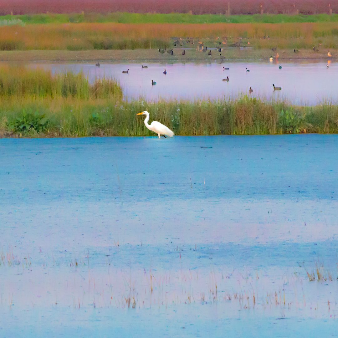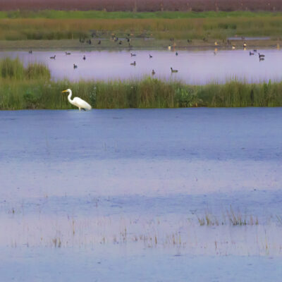 White egret at dusk in wetlands, Woodbridge Ecological Reserve, California near Lodi.
