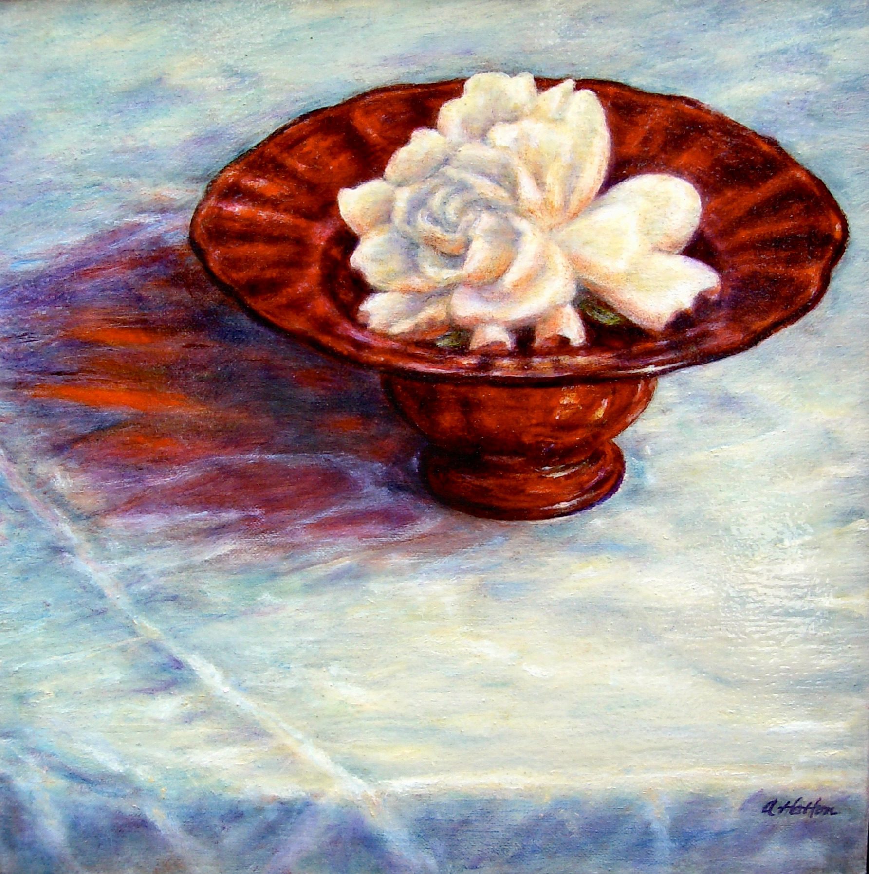 White Gardenia in a Red Glass Bowl by Ayris Hatton Published: February 11, 2023 (3 years ago) $1,100 CategoryPRICE / SIZE / $ 500-$1000STYLE / ContemporaryCOLOR THEME / Multi-ColorsART MEDIUM - 2D / PAINT: Oil PaintSTYLE / RealismCOLOR THEME / Red & OrangeSUBJECT / Still Life Location Studio10″ x 10″ oil on panel,framed with brushed gold moulding Send Message 415 ... show phone Your Name * Your Email * Subject * Message * Website Address