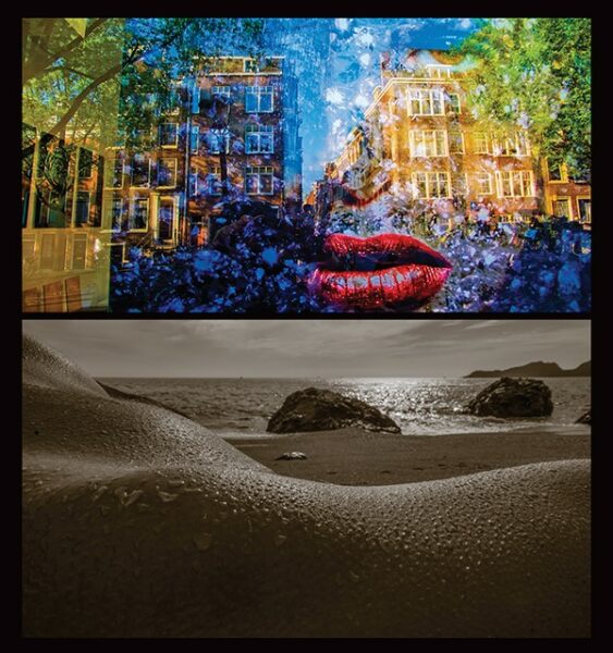 Reflections seeing inside and outside through a single exposure photograph and female form reflecting the landscape at the beach.