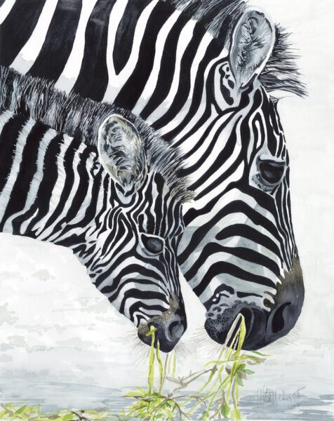 I painted this scene for Mother’s day. A mother zebra is eating lunch with her child, peacefully.