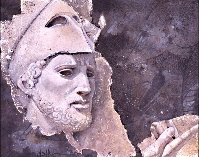 Oil and frescoed painting of an frescoed image of Zeus with backgound vase painting imagery of the same: chief deity of the pantheon, a sky and weather.