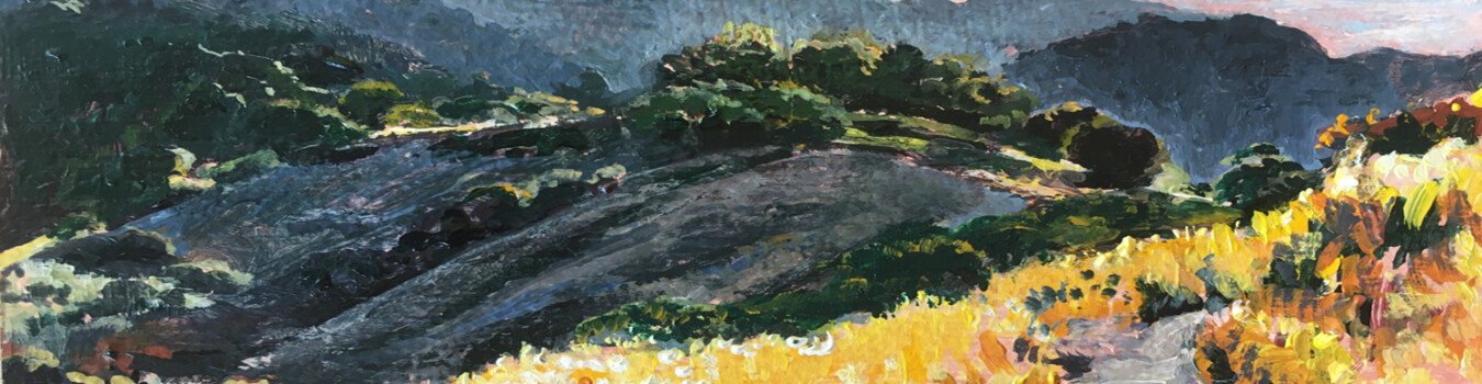 Since childhood I’ve felt moved to create things, usually drawings and paintings. Now I simply love painting California landscapes, particularly light falling on distant hills. A place will resonate with me and I’ll see the composition take shape and go on to sketch onto canvas or board. I study the geometry in the rhythms of hills, curves of pathways and placements of trees, abstractions, and most importantly light. The geometry forms into a composition and then I look for the luminescent light that is the inherent excitement in the design. Prompted by the design and initial drawing I consider color by layering seemingly unrelated tones. The objective of this layering is to give my painting, either acrylic or oil, a richer depth and texture.