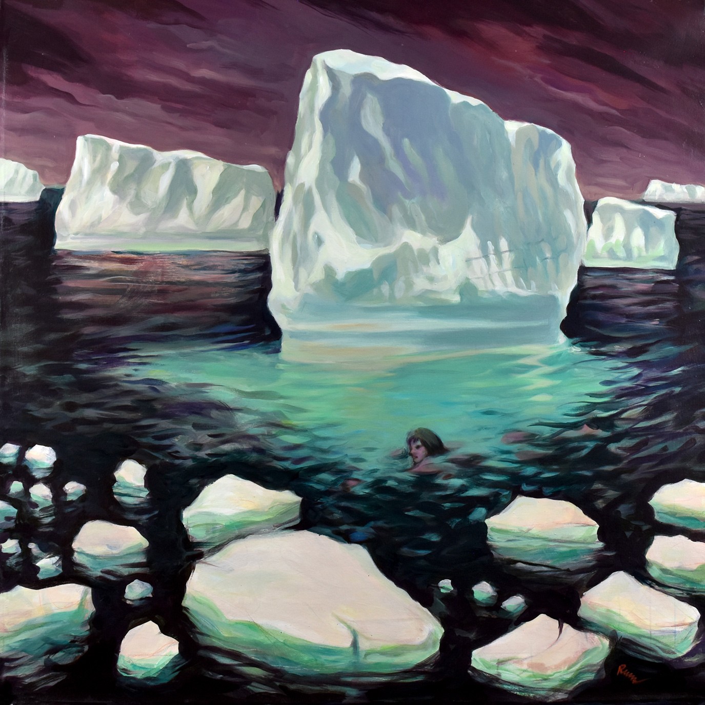Bill Russell exhibits a generous affection for the natural world and places the birds and flowers of his attention in composed scatterings, often on a flat field for scrutiny like a charming abbreviated guidebook. His large-scale paintings of magnificent slot canyons in Utah portray dark and vigorous brush outlines of major forms that appear supernatural in hue, but actually radiate their true pigments of earth. His climate change paintings depict a dramatic fire and ice landscape, inspired by the artist’s trip to Iceland and his fascination with the place and its obvious signs of global warming. Several works depict icebergs that have broken away from the melting polar icecap, becoming vivid novel forms as they slowly thaw. Strange characters also appear in the paintings – in kayaks, on a Nordic sailing ship, or as bathing-capped swimmers treading the inhospitable waters – and these add an ironic twist to worlds of ancient beauty alongside the harsh awareness of humankind’s impact.