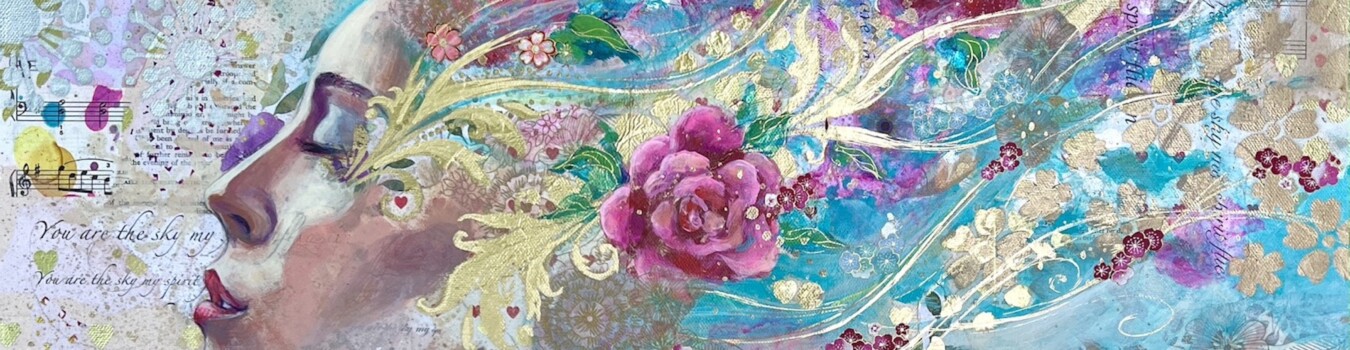 My current work begins with collage and spray paint, and my subject reveals itself through the layers, much like a photograph developing in its bath. The collage materials I use bring in elements of poetry, music, and organic patterns and shapes. The images I weave in through the layers with paint are natural elements inspired by my daily nature walks, or more human emotional tales told through personality-full skulls or portraiture. I enjoy metallic paints for the multifaceted dynamic surface they give the work, changing with the light or perspective.