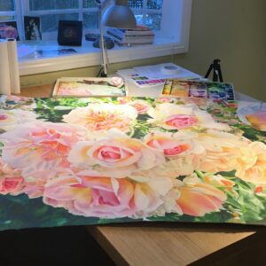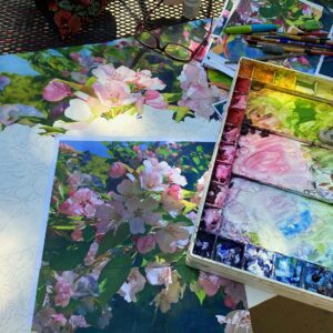 Along with making these paintings, I love to teach and observe the creative process. I believe that acquiring paint handling skills, color and how to really see is the means to a much more important end. There is no one else who is ever going to make the art that is in each of us. Every time we put our brush into a pool of paint and touch it to our paper, it’s us. It carries our mark, like the tone of our voice and the way we sign our name. And the more we do it, the more refined our expression becomes, the more vivid is the illumination of our essence to the watercolor paper. Our consciousness lives in the work we make. With the body of work I’ve created, I see and hold myself altogether differently. I experience a level of freedom that I didn’t imagine was possible. I am more myself than ever by allowing myself to grow through my paintings. And I see this happening with the artists who regularly paint in my groups.