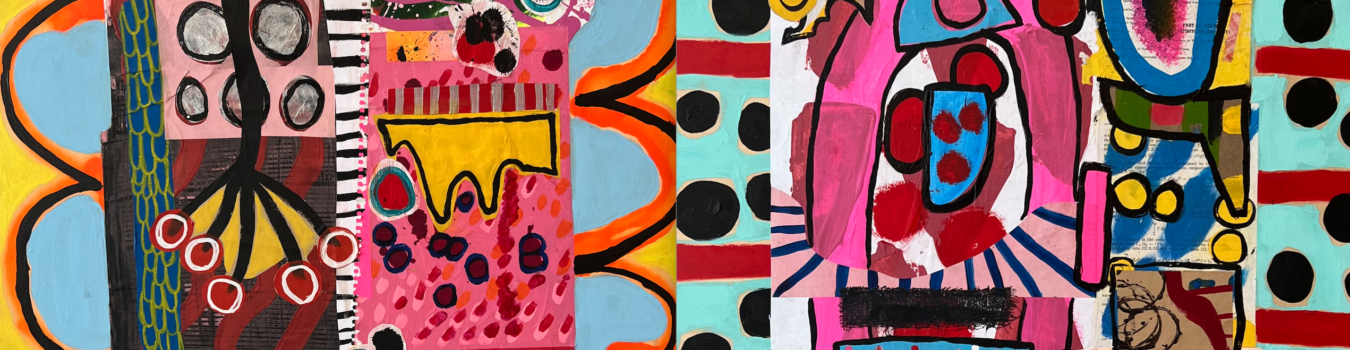 Voyage to a bright feel-good universe in Dianne Admire’s high-energy collage paintings.