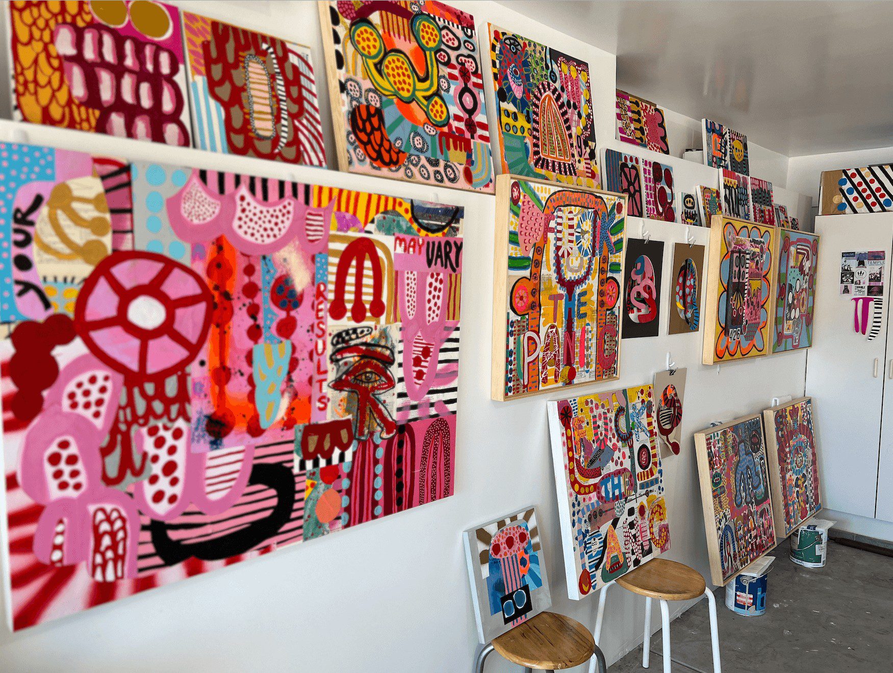 Voyage to a bright feel-good universe in Dianne Admire’s high-energy collage paintings.