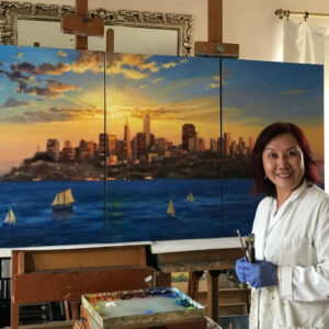 Teresa’s passion for art was influenced by her father Hong-Zhang Dong. From the age of five, he taught her both calligraphy and traditional Chinese art. She continued to study under Professor Zhong-Zhou Cheng from Tong Ji University in Shanghai. In 1980, the U.S. Consul General in Shanghai was so impressed with one of her Chinese paintings, that he granted her a visa to study Western art in the United States. Once in the U.S. in order to achieve financial independence, Teresa developed a revolutionary washable silk product for her first collection of women’s apparel under the label of “Usagi”. Living in California provided her with a rich landscape for her plein-air oil paintings which invite the observer to see a subject portrayed forever at a particular moment in time. Teresa’s use of color in her work is sensitive, and her interpretation of life’s details and nature is evocative. Teresa studied at the Hong kong University, The Academy of Art University, San Francisco, and also with Professor Boris Kokhno from the St Petersburg Art Academy. She is a member of California Art Club and Oil Painters of America. Teresa’s work has been shown throughout the United States and she has been recognized with many awards. Her art resides in collections internationally.