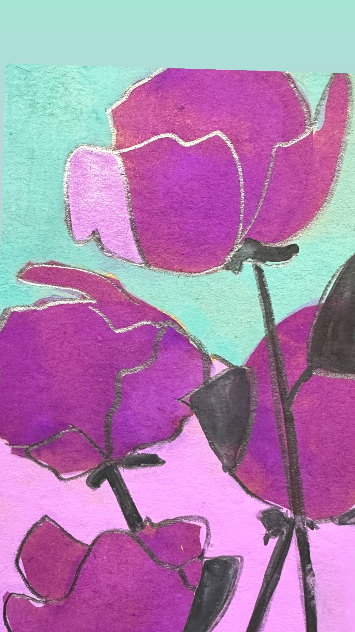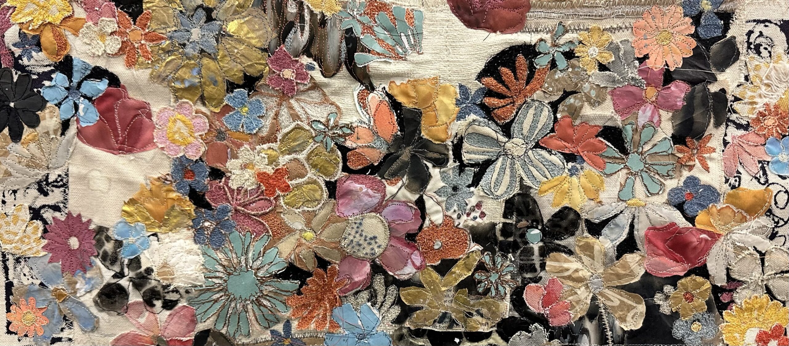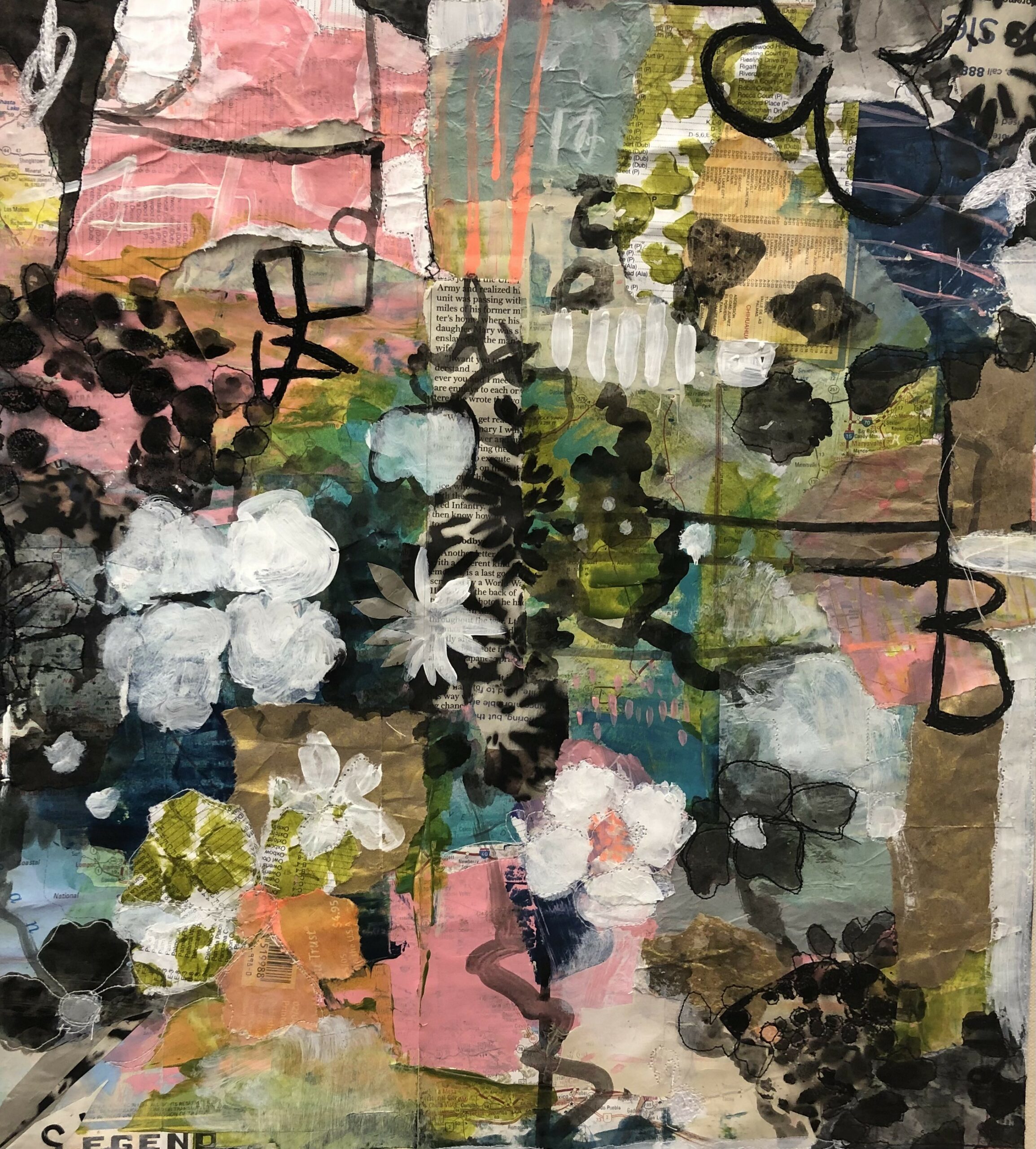 My work is made up of a wide range of materials, often using whatever is at hand. The pieces include recycled papers which are painted, cut up and collaged – often mixed with silk, thread, acrylic, graphite and ink. I also am a sculptor, working in recycled metals. I am a firm believer in using what I have, and no scrap is too small.