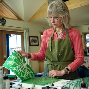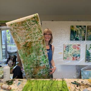 Creating a painting is a bit like a walk in the woods for me. I approach my art with a sense of adventure, using experimental techniques along with tried and true methods, but I’m always hoping for a surprising and delightful discovery. A key component of my art is the use of monoprints created using a gel plate. Sometimes the prints are created with actual plants, other times with stencils. I make my own tree stencils based on the silhouettes of trees I encounter on my walks and other adventures. Using these prints and multiple layers of paint, my mixed media works celebrate both the wonder of art making and the beauty of nature. I hope my art encourages you to take a closer look, at both art and nature – and perhaps inspires a new perspective on your next walk in the woods.
