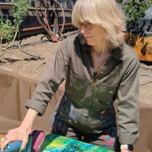 Lucy Ames has been making and teaching art for decades. She teaches art at two Berkeley Schools and runs summer art camps for kids in her El Cerrito backyard studio. While she’s always had her own artistic pursuits including encaustic collage, jewelry making and kiln formed glass, it wasn’t until the pandemic slowed us all down that she started painting every day. For the last five years, whenever she’s not teaching, she can be found hiking the trails or in her studio painting and printing the inspiring shapes of nature. Always exploring new ways to approach her art, Lucy loves combining her well practiced intuition with the element of chance that her varied materials and methods provide.