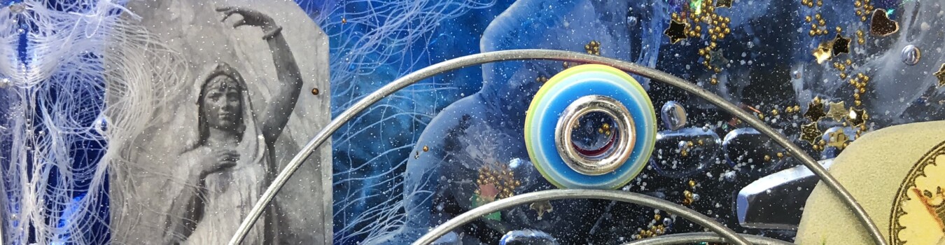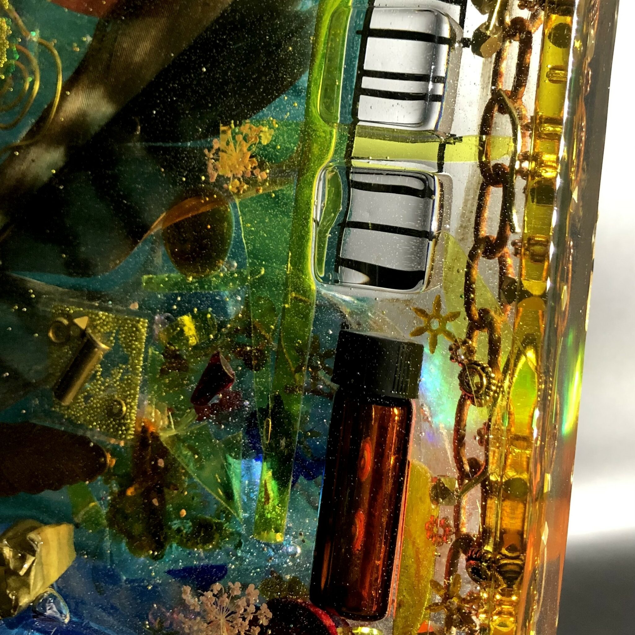 I submerge found objects, collage elements, and collectibles into resin. My sculptures enshrine these objects in devotion to humanity, spirit, materials, whimsy, and the passage of time. These shrines rely on the unique ability of resin to suspend multiple dimensions in an ethereal time capsule. With this medium I am able to explore the interlacing of the objects’ individual natures in a web of complex multidimensional relations.