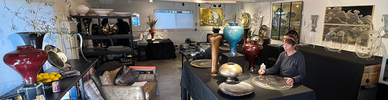 Bay area artist Victoria Weiss of Croworks brings her decades of muralism and églomisé creations combined with Daniel Bletterman’s ceramic talent exhibited in major art shows across the country to create the Croworks Bletterman Design Studio. With their expertise together they are producing elegant slumped glass featuring gold leaf details, large scale bronze pieces with unique hand fired patinas, and large scale églomisé surfaces from furniture to surfaces, to lighting fixtures.
